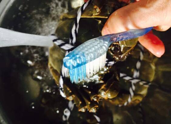 1、在自来水龙头下,用牙刷将蟹周身洗刷冲洗干净。