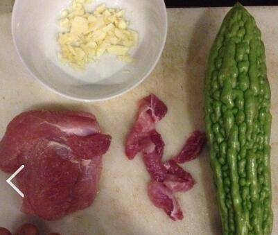 蒜头切碎,凉瓜切成条状备用(可切成薄片,形状各人喜好)。