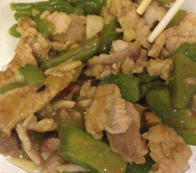 开始炒,放调和油,油热了后放蒜末和适量盐,然后放上凉瓜快速爆炒,其间放上料酒,过一会放上清水,鸡粉,然后继续爆炒,见凉瓜7成熟时放上糖与少量酱油,炒一会后可以放上瘦肉继续爆炒,注意此时要有水,见肉熟了,收干水分,之后可以上碟了。