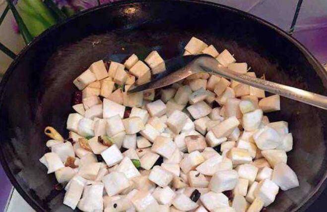 5、放入胡萝卜丁翻炒变色。
