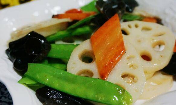 木耳泡发,胡萝卜切片,莲藕切片,荷兰豆去除筋,并准备好水淀粉。