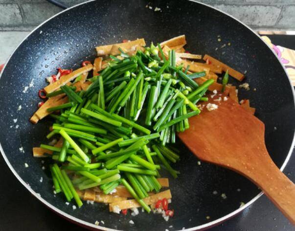用料:韭菜花一小把、五香豆腐干3块、蒜米2瓣、辣椒2个、生抽适量、食用油10克、盐2克。
