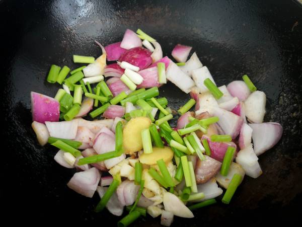 7、放入葱姜蒜、花椒粉爆香。