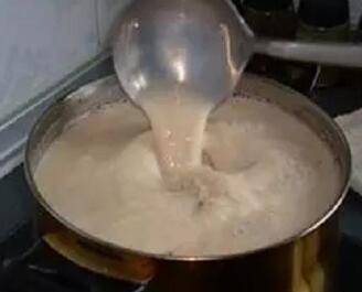 4、将鲜奶倒入锅中,加少许盐,多次扬沸,可以适当降低温度,防止牛奶因长期处于过高温度而生成不利健康的糖基化终产物。