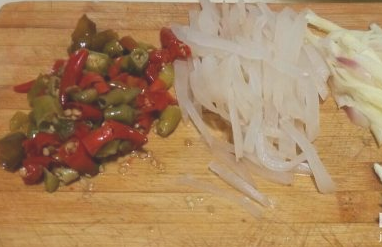 将泡海椒、泡姜、泡萝卜、蒜洗净并且切好;