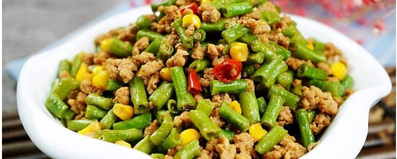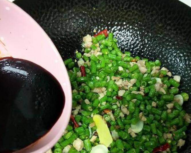 材料:猪肉、豆角、葱姜蒜、花椒、青椒、干红辣椒。