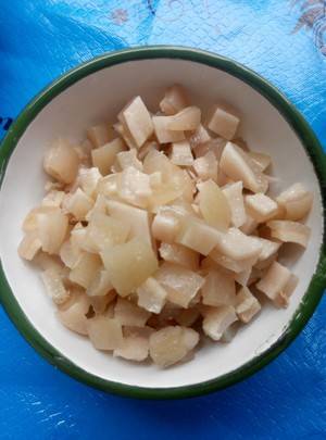 3、把瘦肉、肥肉、猪皮分开切成丁。