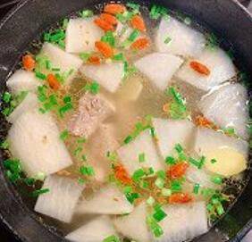 2、白萝卜去皮切滚刀块,肋排剁成块,香葱切成葱花,切好姜片,洗净枸杞。