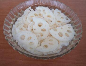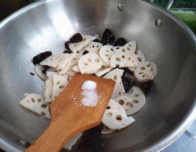 再起油锅,葱姜煸香后放藕片入锅炒。