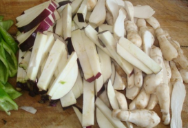 茄子、鸡腿菇、青椒洗净切成条状;