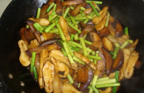 待葱变色后,放入切好的鸡腿菇、茄子和青椒翻炒,三分钟后放入老抽和盐继续翻炒;