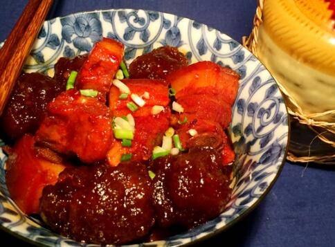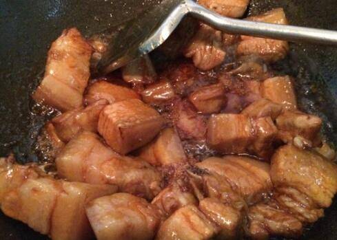 12、加酱油、黄酒、老抽少许。大火烧开后小火炖1小时左右,把做好的山芋粉圆子放入肉中,加稍许盐。