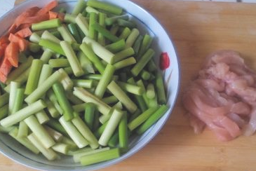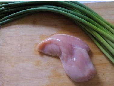 准备好鸡肉和蒜苔;