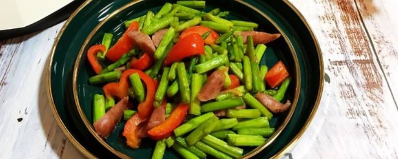 主料:香肠1根;辅料:芦笋200克,红甜椒半个,油10毫升,盐2克,生抽5毫升,姜2片。