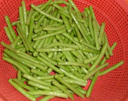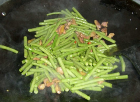 准备食材:豇豆400g、食盐适量、酱油适量、姜适量、柿子椒30g。辣椒切块,鸡肾切块,姜切丝;豆角折成段;下油,放进辣椒、鸡肾和姜丝煸炒;放进豆角,最后加盐和酱油调味即可。