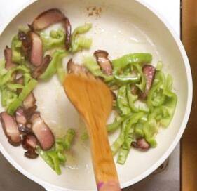 1、青椒去蒂去种切段,姜丝,腊肉切段备用。2、锅中倒油,加入姜丝,倒入腊肉,翻炒均匀。3、倒入青椒,加入盐和鸡粉调味,翻炒均匀即可出锅。