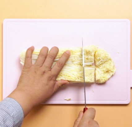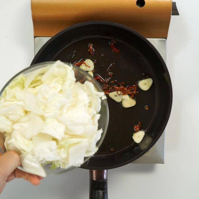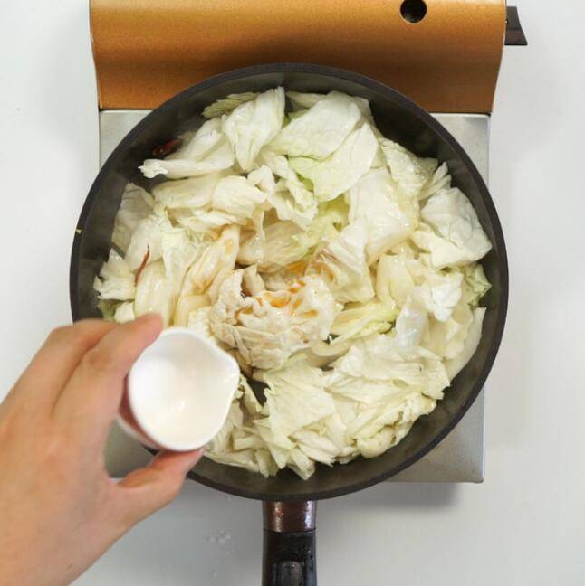 4、倒入白菜,翻炒均匀,倒入醋、生抽,翻炒均匀。