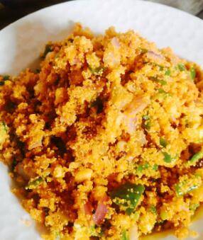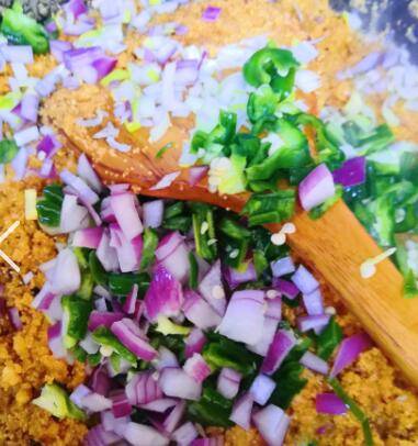 入洋葱丁,青椒丁,适量盐,稍微翻炒即可出锅。
