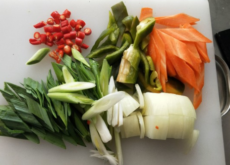 蒜苗2颗、洋葱100克、胡萝卜50克、青椒50克、小米辣2个改刀备用;