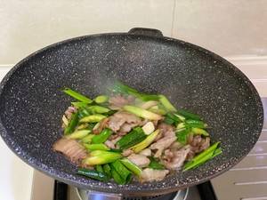 3、下姜丝,蒜苗大火爆炒。