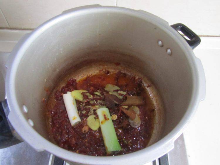 3、炒出红油后下入其它大料翻炒,翻炒出香味后加入适量的水,放入牛肉和藕进去。