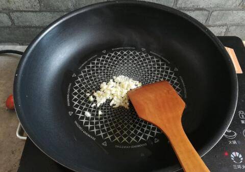 8、热锅冷油,倒入5克油,放入蒜米爆出香味。