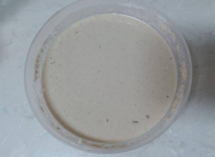 4、山粉糊倒入锅前,一定要搅拌均匀,因为静置一会就沉淀了,粉糊倒进去后,转中小火,快速的转动锅一圈,使粉糊铺满整个锅。