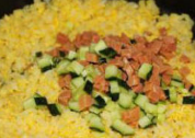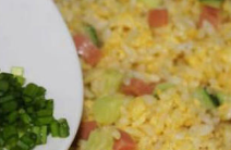 往里加火腿丁跟青瓜丁,翻炒均匀。