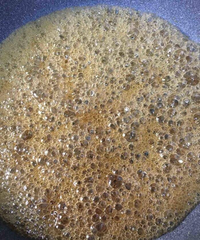 4、从大泡煮到小泡,并且有焦糖色了,就可以加入核桃仁和白芝麻,翻拌均匀。