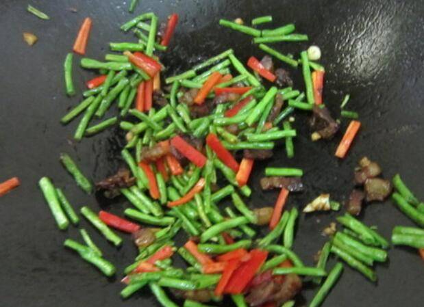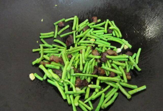 5.把豇豆下锅煸炒。