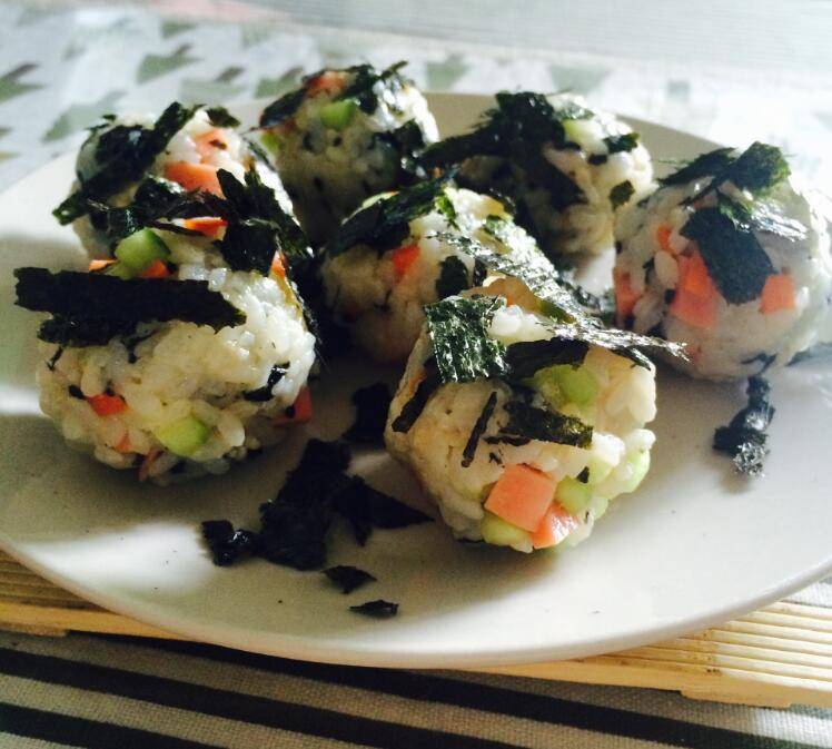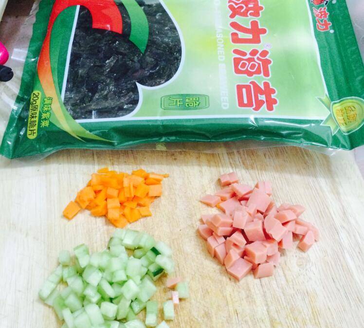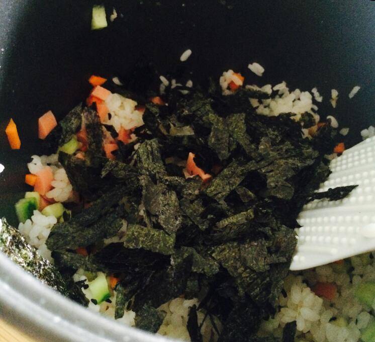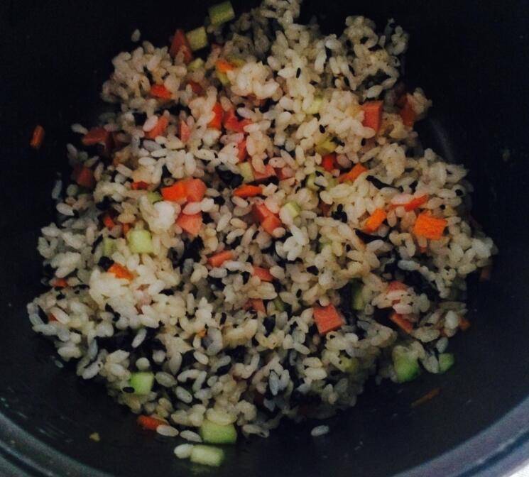 2、青瓜、红萝卜、香肠、芝麻、香油、海苔放入米饭中。