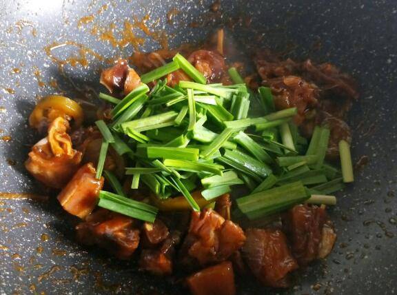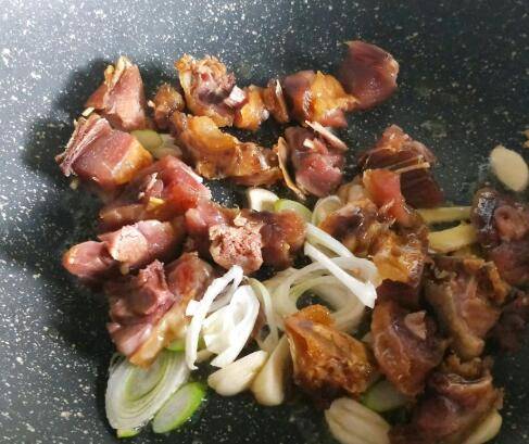 3、炒锅放少许油烧热,放姜葱蒜煸香,倒入腊鸭腿翻炒。