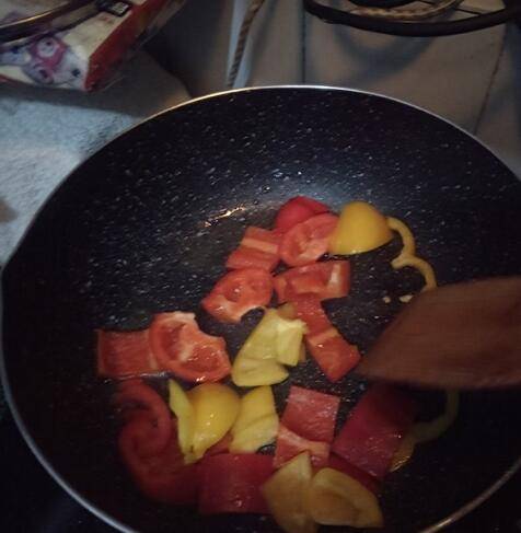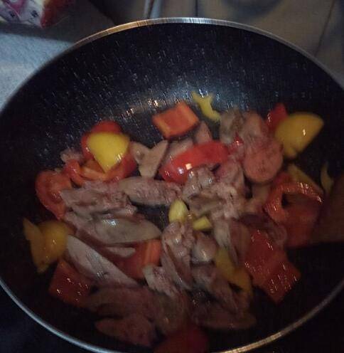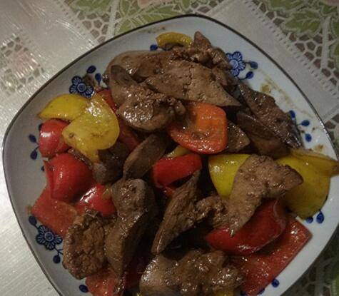 主料:鸡肝250克、彩椒2个。辅料:植物油适量、盐适量、白糖一勺、蔬菜粉一勺、一品鲜一勺。