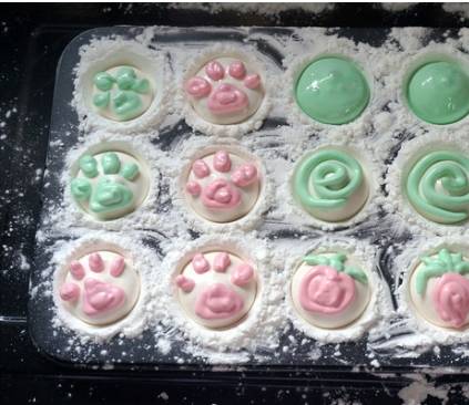 5、将棉花糖糊装入裱花袋中,挤入连模中,用熟玉米淀粉覆盖,放置两个小时即可食用。