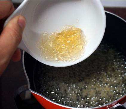 3、37克细砂糖放入奶锅中,加入37克麦芽糖、21克清水,加热至118度熄火。趁热加入软化的吉利丁片并搅拌均匀。