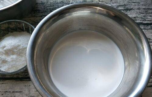 椰浆里面倒入另一份200克牛奶,再加入白糖搅拌。