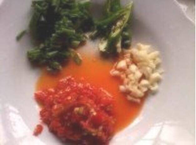 2、净洗净的青椒、大蒜切碎,细香葱切成小段,取适量的剁椒备用。