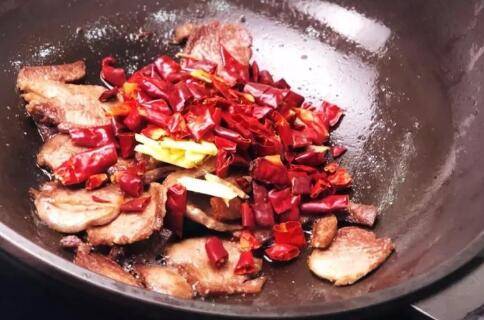 将肉片煎至两面焦黄,倒入干辣椒翻炒。
