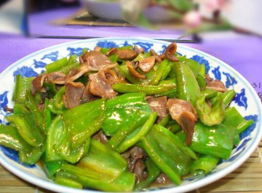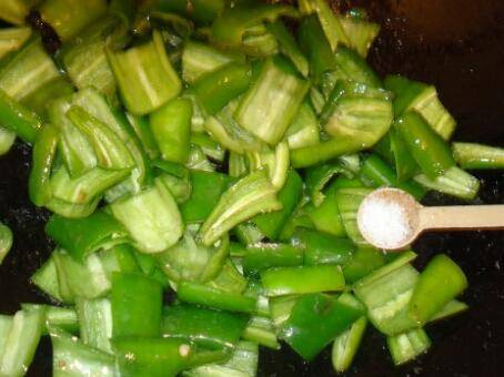 放入尖椒翻炒,翻炒变软,放盐、味精。