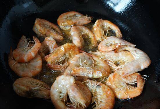 8、虾下锅翻炒均匀,滴入几滴醋会保持虾皮的脆度。