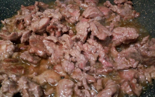 3、用的是菜籽油(菜籽油要等到冒烟以后,再放牛肉片),倒入牛肉片快速滑炒,滑炒至牛肉片变色,盛盘。
