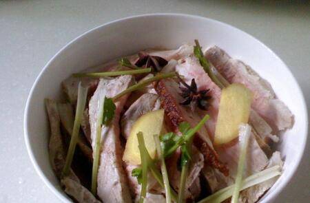 肉皮朝下,码入碗内,面上放上八角、香菜、姜片。