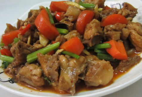 鸡和红萝卜切丁,姜切丝,芹菜切丝;先炒鸡丁,撒上盐,淋上醋或料酒炒片刻;放进红萝卜和辣椒,淋上生抽,炒匀;添加适量清水,将红萝卜和鸡丁焖香焖熟;收汁,调进芹菜,撒上味精即可出锅。