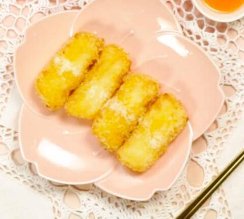 放入奶片,依次均匀裹上淀粉、蛋液、面包糠。