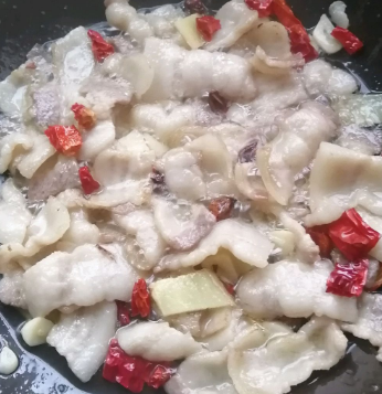 五花肉切均匀的片,姜蒜切片,干辣椒切段。