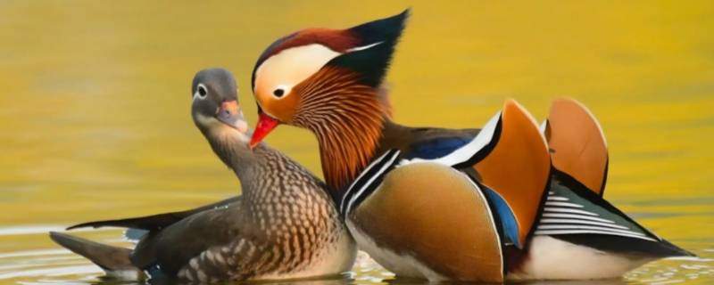 鸳鸯一词里鸳指雄鸟,鸯指雌鸟。雄鸟和雌鸟的外表有很大的差别,雄鸟的颜色更艳丽,它的嘴是红色的,脚为橙黄色,眼后有白色的眉纹,翅膀上有栗黄色的直立羽。雌鸟的嘴为黑色,整体呈灰褐色,色泽比较单一。