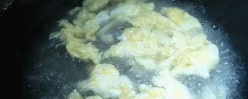 3、开小火,锅烧热,加入油,倒入打散的鸡蛋。搅一下,形成鸡蛋块。