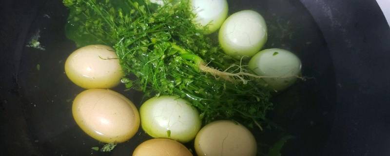 3、锅里加水,下入鸡蛋、生姜、艾草。先用猛火煮,水开后转为小火。