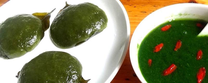 2、新鲜艾草摘干净水煮一下,然后切成细丝或者用果汁机打碎备用。