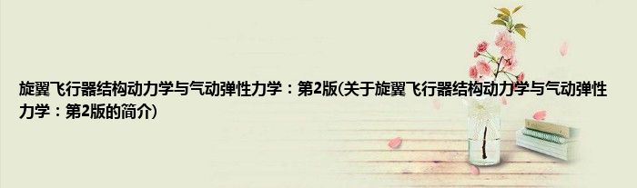 1、 《旋翼飞行器结构动力学与气动弹性力学:第2版》是2014年中航出版传媒有限责任公司出版的图书。